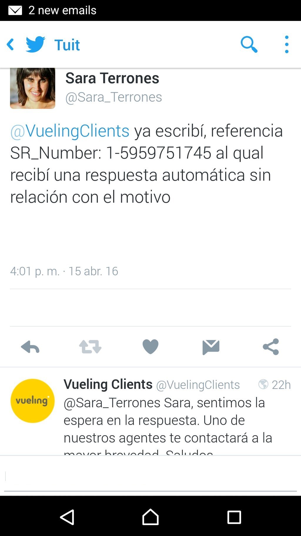 me gustaría saber si recibieron nuestro último email con referencia (referencia que te ha dado vueling, SF seguido de números), envíado el pasado (fecha), en relación al retraso del vuelo (número de vuelo) (origen-destino) del (día del vuelo), ya que no tuvimos ningún mail de respuesta.