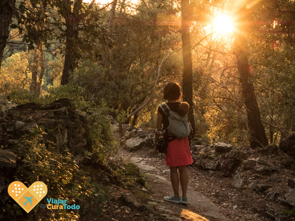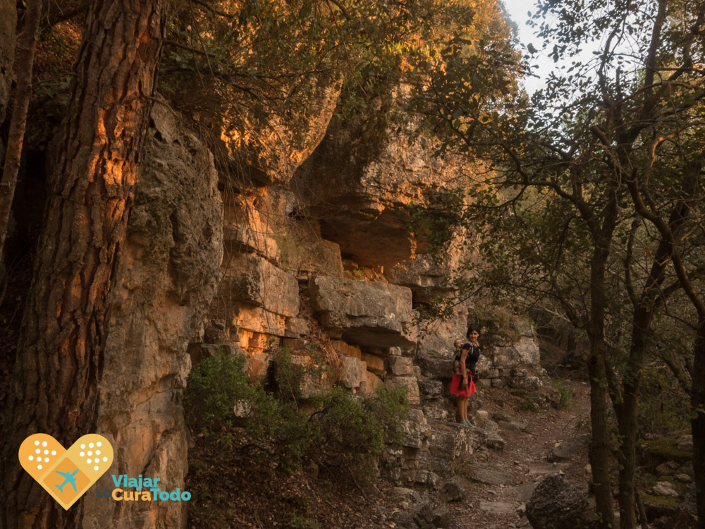 El camino se vuelve un sendero estecho por el cuál solo se puede pasar en fila, por lo que hay que portear sí o sí. Al empezar a ganar altura, en algún tramo hay que agarrarse a un árbol o dar algún paso un poco más largo, pero es muy asequible. Una vez arriba, hay agujeros en las rocas y hay que tener cuidado de no meter el pie en las grietas. Nosotros nos encontramos a un par de famílias cuyos peques estaban jugando como si estuvieran en un castillo (¡imaginación al poder!)