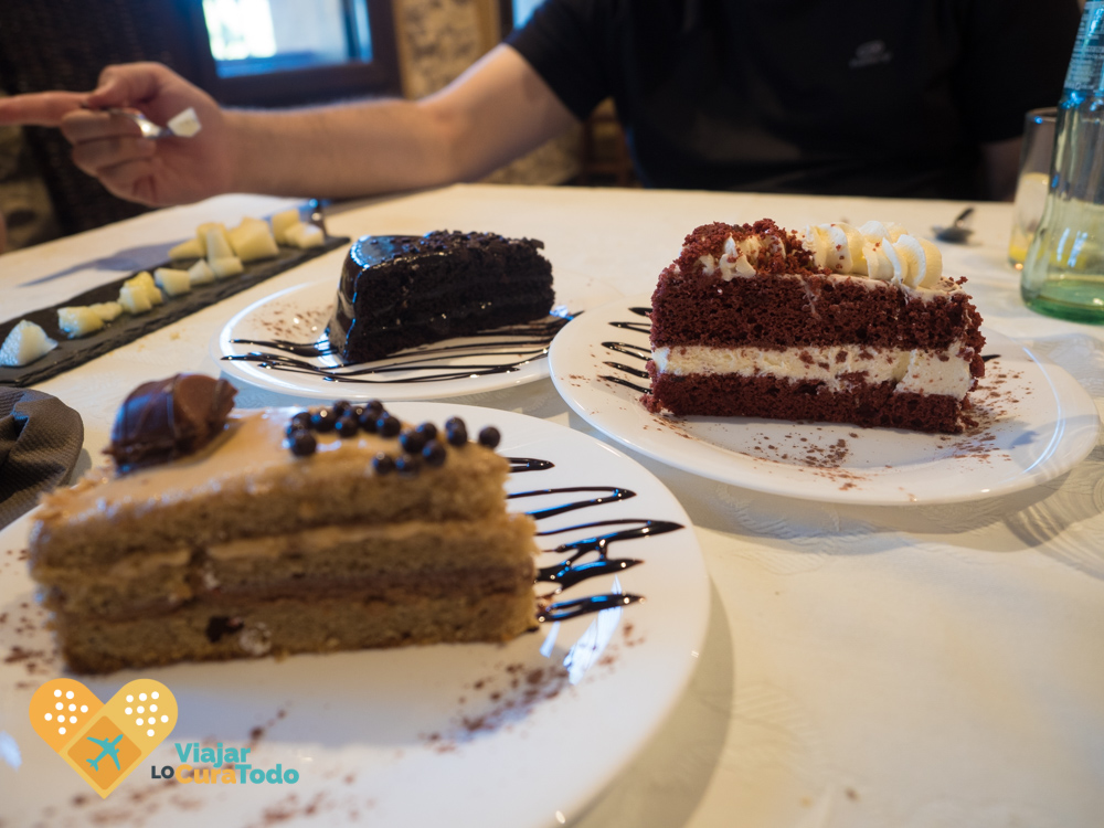 Aunque las tapas que iban saliendo tenían muy buena pinta, nos decantamos por el menú de fin de semana, con 4 primeros y 4 segundos a elegir, por 25,50 euros (postre bebida incluido), más un pequeño «tastet» inicial de uno de los platos de la casa. Trabajan con producto de proximidad y temporada, y nosotros queremos destacar los postres. Los tienen expuestos en una vitrina y nos tuvimos grandes dudas sobre cuál elegir, ya que todos entraban por la vista.