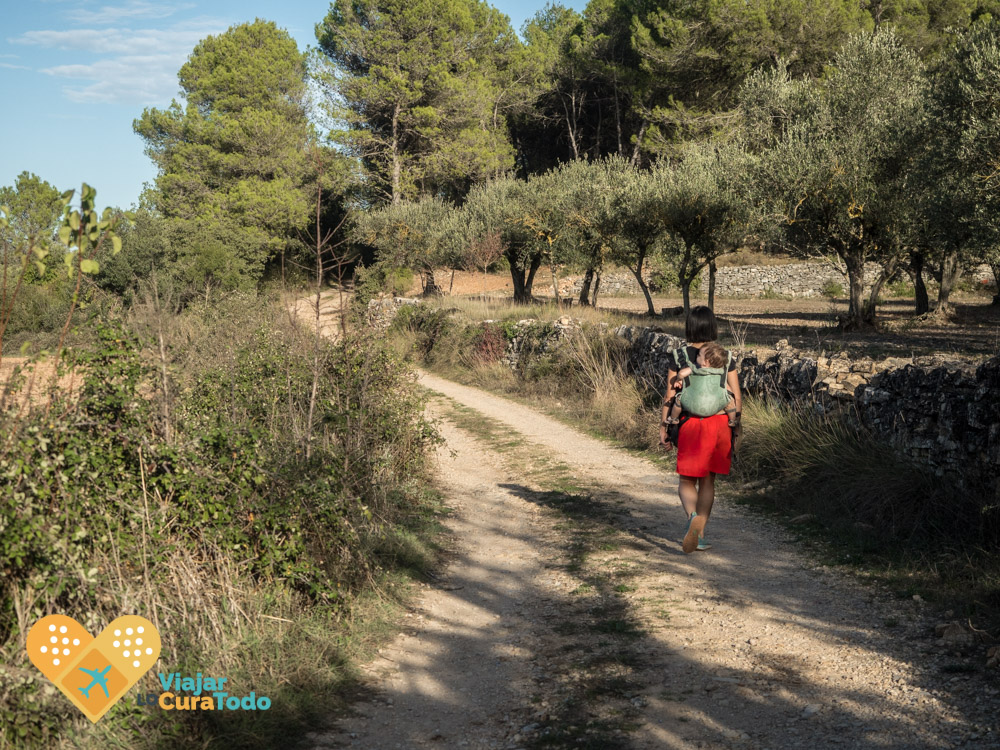 La ruta de la Font Cuitora es una ruta muy cortita (30minutos ida y vuelta) que sale desde el parking del campo de fútbol situado a las afueras del pueblo. Se camina por una pista ancha asfaltada, y en la propia guía indican que se puede hacer con cochecito de rueda grande. Dado que nosotros siempre porteamos, no es algo que nos preocupe demasiado en el momento de elegir una ruta por montaña, pero en este caso es muy factible.