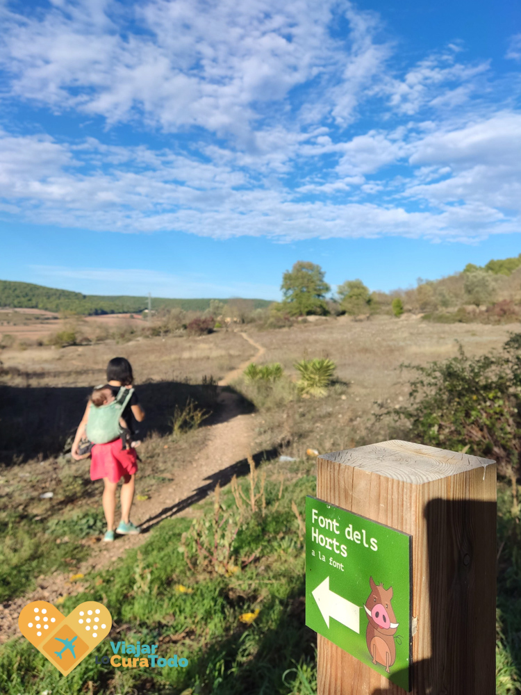 El inicio del camino es ancho y plano, pero no recomendamos hacerla con carrito porque hacia el final, yendo a la Font dels Horts, tiene un poco de subida y es más pedregoso, aunque sigue siendo fácil de hacer. La fuente se encuentra en un desvío (debidamdente marcado) hacia la izquierda. La sequía ha hecho estragos y no baja agua por el caño, pero aún hay algo de agua en una pequeña balsa, que antiguamente abastecía a los huertos de la zona.