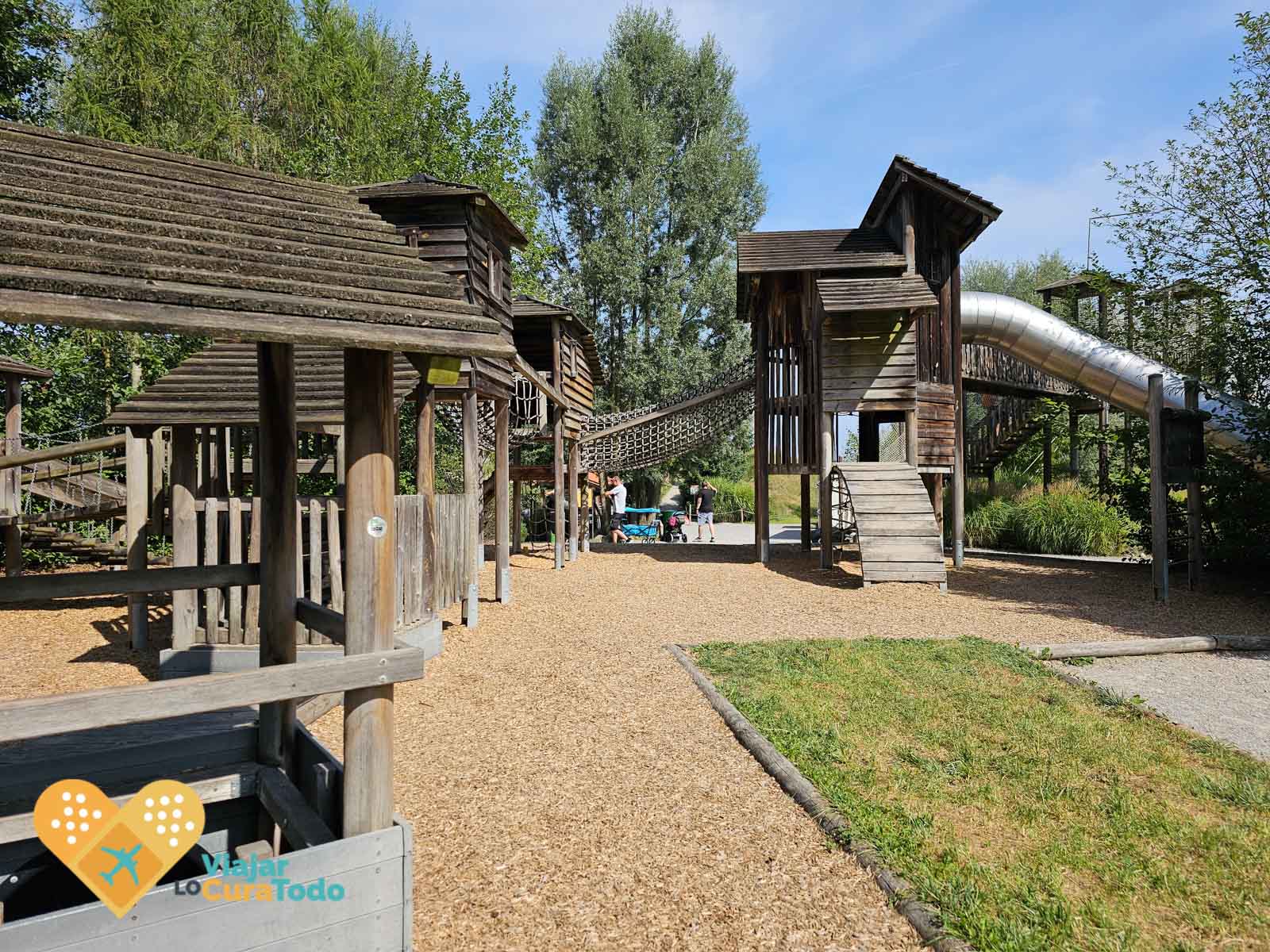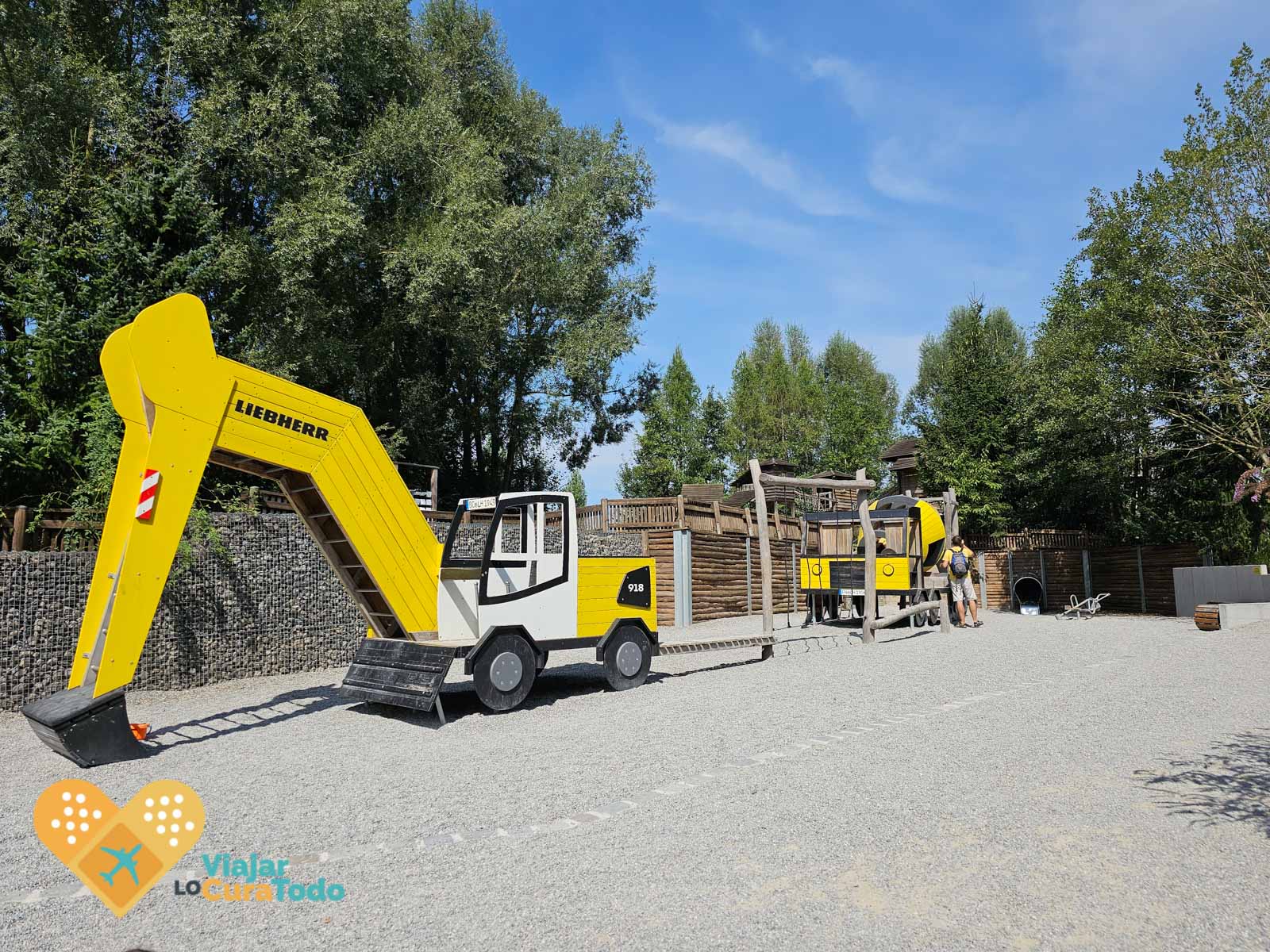 Mención aparte merecen los parques que hay dentro del recinto, ¡ya nos gustaría tenerlos aquí! Un parque Liebherr de excavadoras para trepar, otro con presas para jugar con agua, y uno de cuerdas para trepar, desafiando la gravedad.